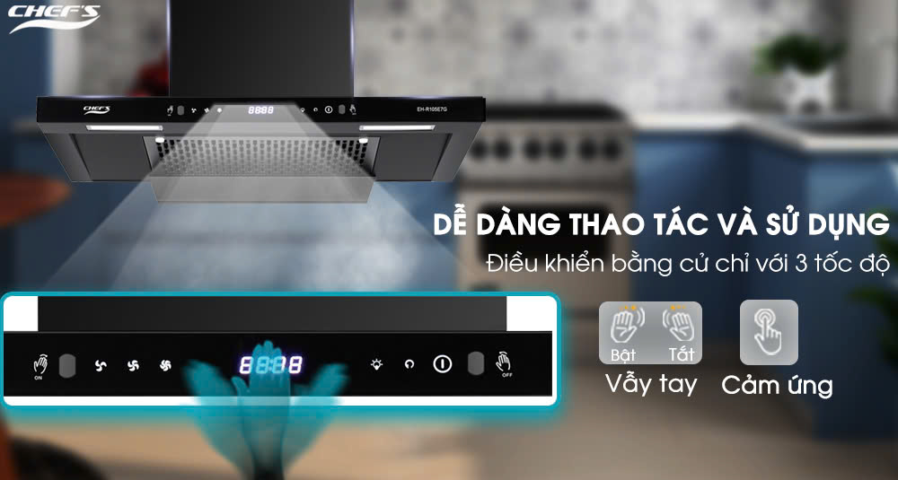 - Bên cạnh đó, hút mùi EH-R105E7G sử dụng bảng điều khiển cảm ứng hiện đại với màn hình hiển thị sắc nét, giúp người dùng dễ dàng thao tác và điều chỉnh các chức năng. Đặc biệt, để nâng cao trải nghiệm sử dụng, chiếc hút mùi này còn tích hợp tính năng điều khiển bằng chuyển động thông minh. Chỉ với một cử chỉ vẫy tay nhẹ nhàng, người dùng có thể bật/tắt máy và điều chỉnh tốc độ hút mùi một cách nhanh chóng và tiện lợi, mà không cần lo lắng về việc tay bị dính dầu mỡ, giúp giữ cho bề mặt thiết bị luôn sạch sẽ.