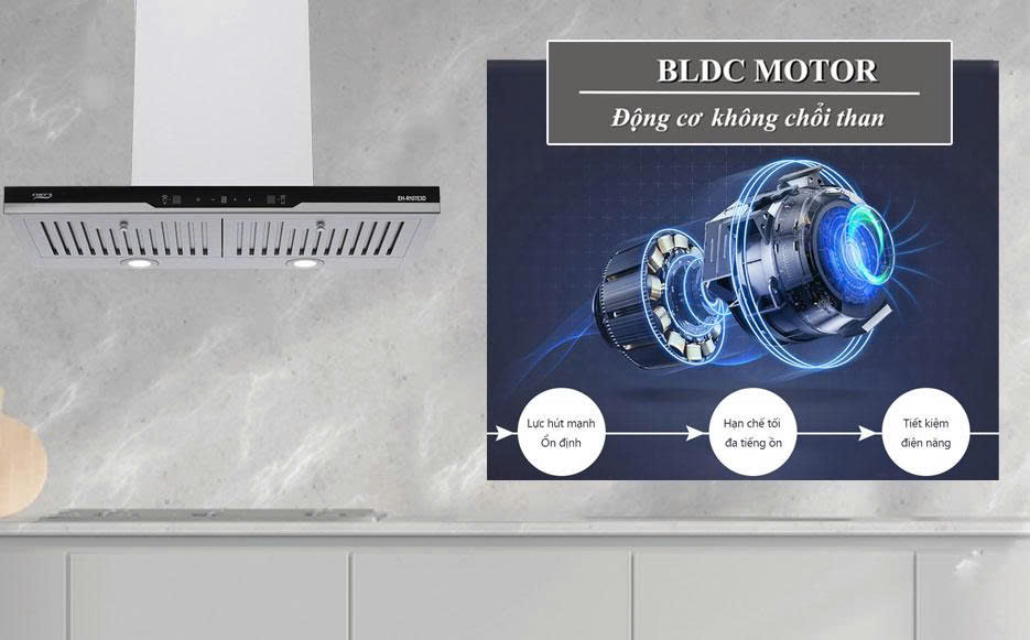 Hút mùi sử dụng động cơ BLDC hiện đại với tuổi thọ động cơ cao, tiết kiệm tối đa điện năng khi sử dụng